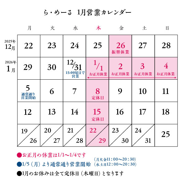 🟥1月定休日…1/8(木)、1/15(木)、1/22(木)、1/29(木)